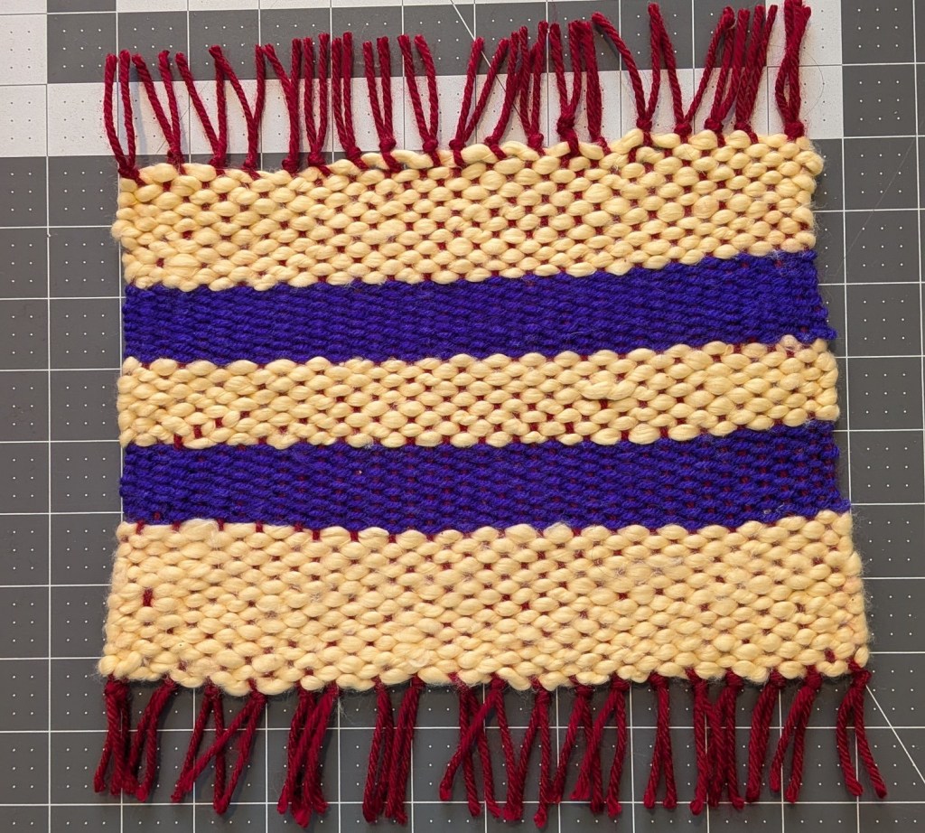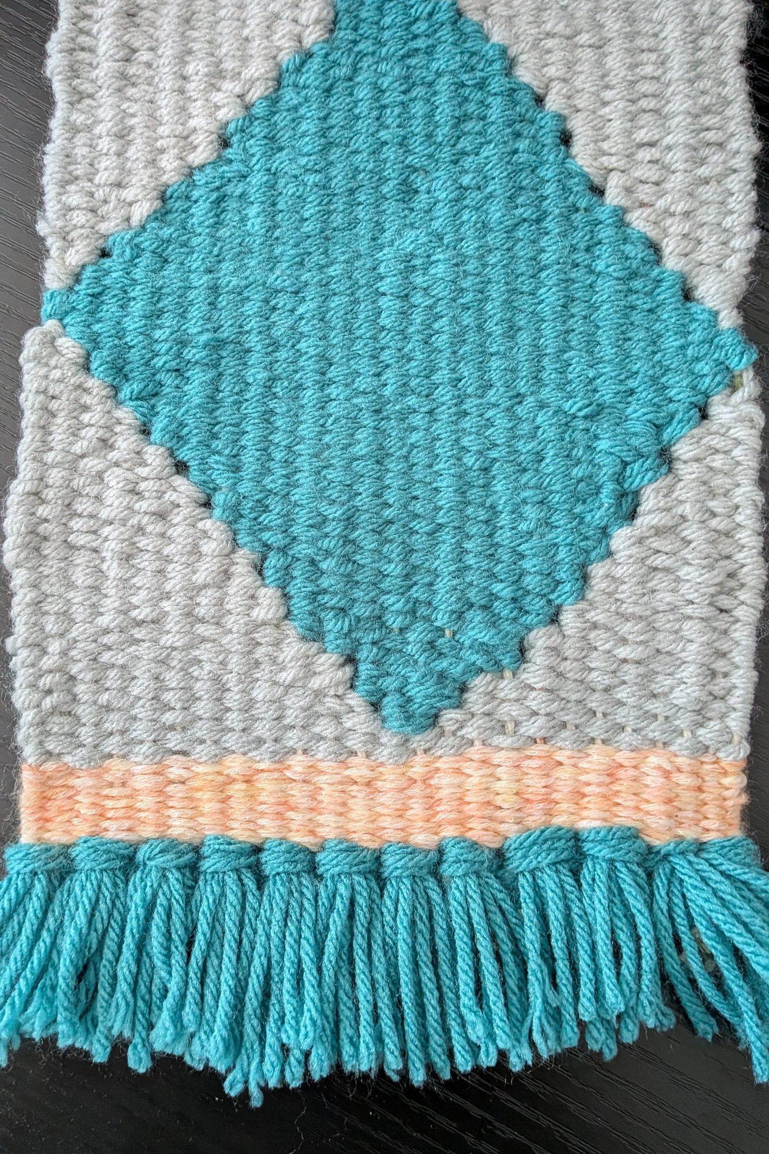 My second attempt was more challenging: a diamond shape in teal woven against a field of gray, with a peach stripe and teal fringe. It involved what’s called a “tabby” weave with double strands of yarn, giving an interesting texture to the product. But the diamond is off-center. I should have begun with an even number of warp threads, (the stationary threads you weave around), which the instructions didn’t mention. There were yarn tails everywhere that I had to weave (clumsily) into the back side. However, the exercises taught me a lot.