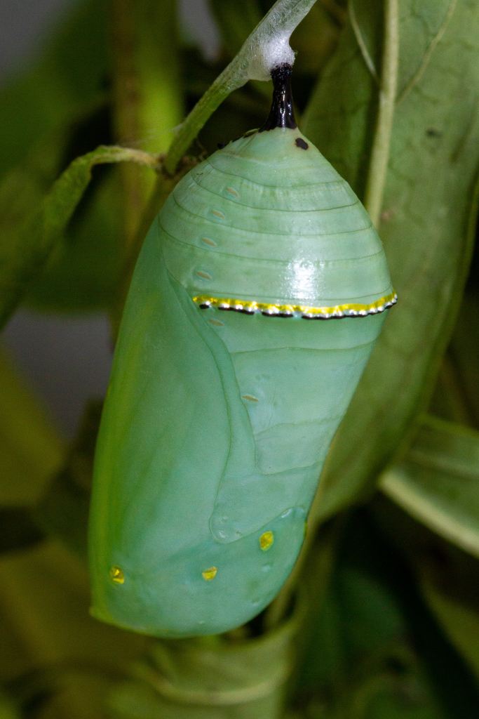 Thankfully, there are many species of milkweed, as it’s the only host plant for Monarch caterpillars and essential to their survival. Toxins in milkweed render it poisonous for other species but confer benefits to the caterpillars adapted to consume it. Most birds and other predators recognize the black, white, and yellow striped Monarch caterpillars, as well as the orange-and-black pattern of adult butterflies and generally leave them alone. With each phase, called an “instar,” a caterpillar molts, shedding skin too small to accommodate its growing girth, before finally crawling to the nearest high point for safety. It may travel as far as thirty feet away, to form a chrysalis where it remains housed until eclosure a week or two later. The chrysalis suspends from a pad of tiny silk-like threads spun by a gland just below the caterpillar’s mouth. The threads are incredibly thin, like the fluff of cotton balls, but amazingly strong.